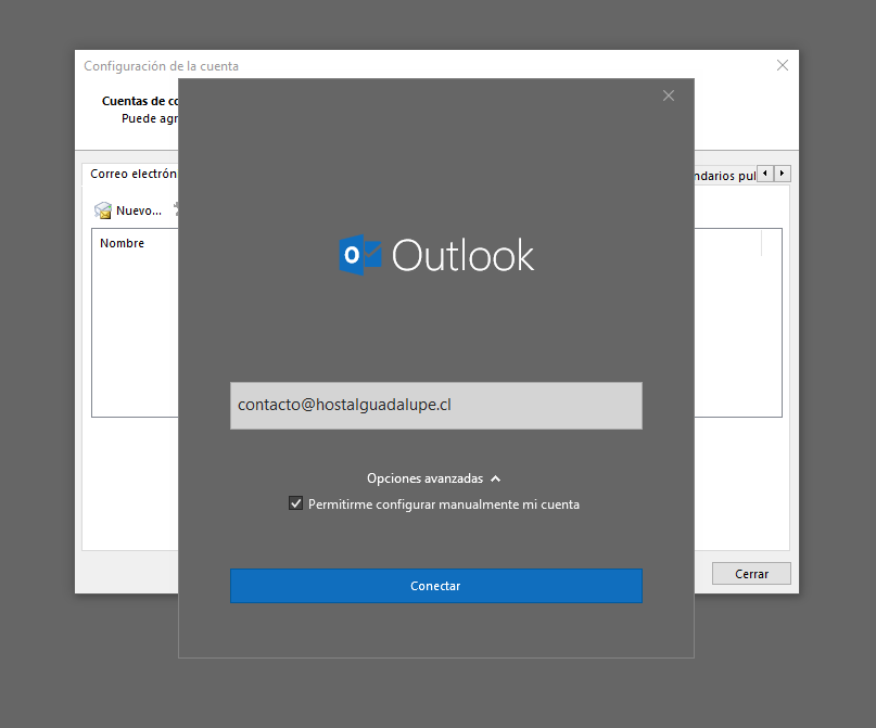 Al iniciar Outlook por primera vez le mostrará la opción de configurar un correo de manera automática. Outlook puede configurar el correo de nuestro servidor de forma automática, pero nosotros recomendamos que lo configure usted de forma manual, siguiendo los siguientes pasos.