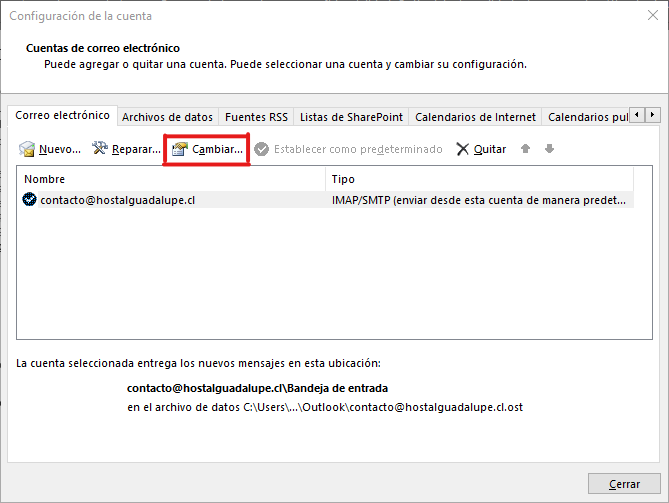 8. Luego manteniendo seleccionada la cuenta de correo que desea revisar su configuración, hacer clic en “Cambiar…”